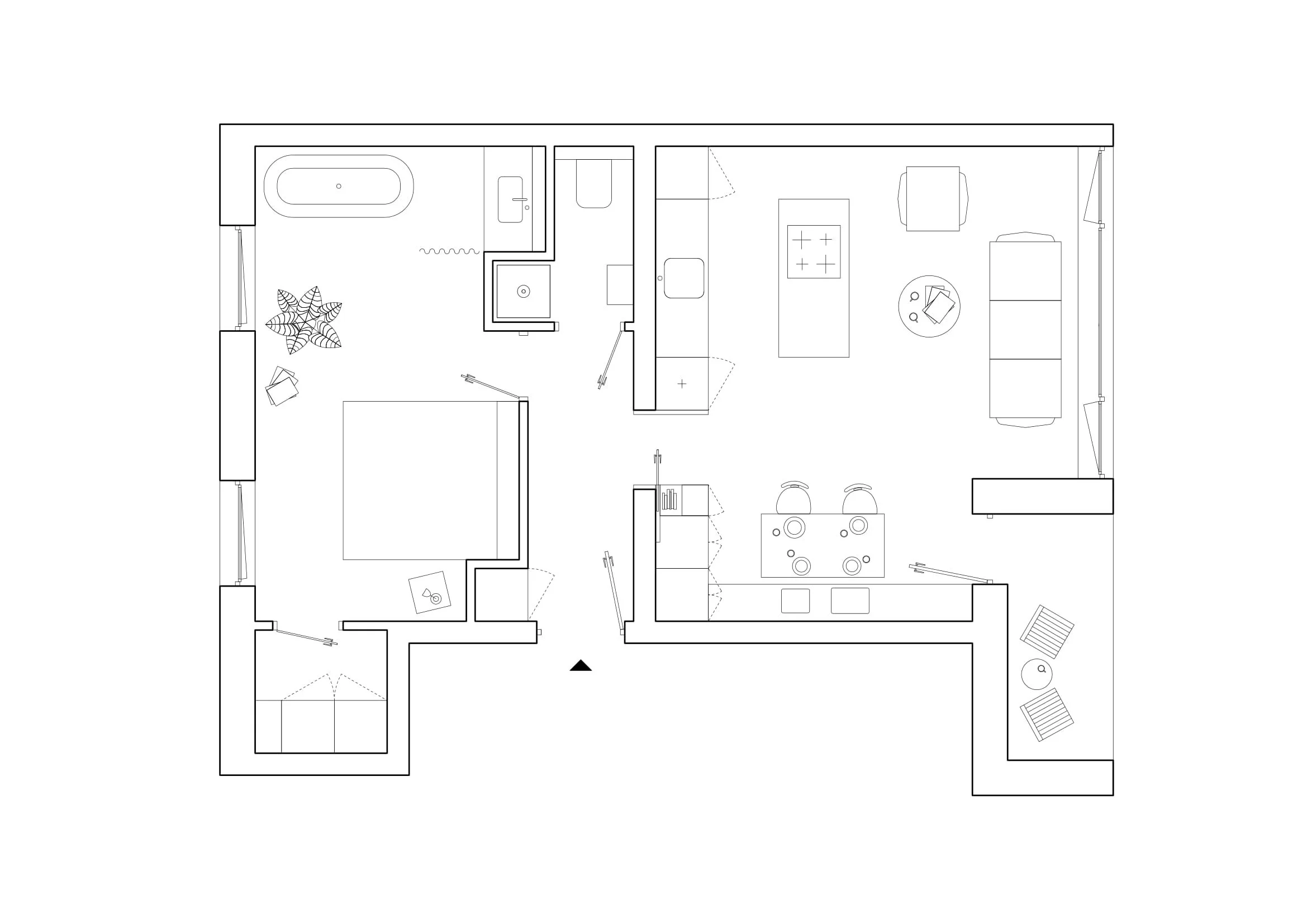 Med målet med at ombygge denne toværelses lejlighed til en fleksibel bolig ideel til deltidsudlejning, tilbyder det redesignede layout et åbent badeværelse og soveværelse samt en optimal indretning af stuen, der kan tilpasses både faste beboere og deltidsudlejere. De indbyggede møbler præsenterer en ren og moderne stil, der tilfredsstiller diverse gæster.